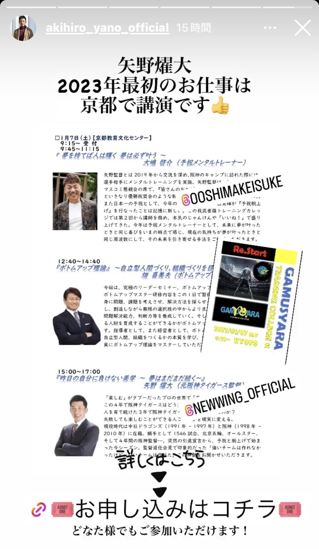 元阪神監督 矢野燿大さん、うっかり予祝トレーナーと講演会を開いてしまうwwwwww