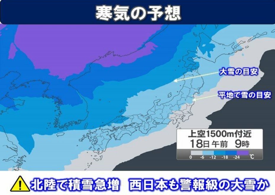 今季最強寒波 北陸で100センチの降雪予想 西日本も警報級の大雪か 18日から19日