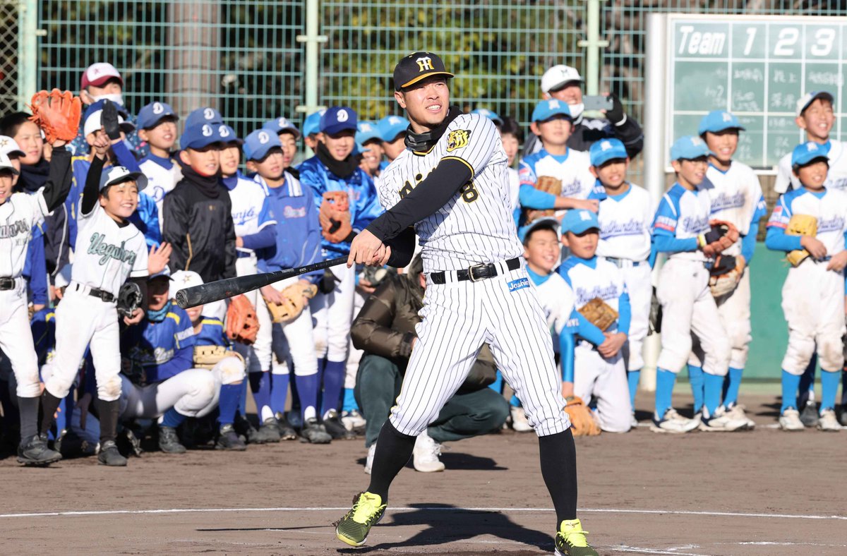 阪神・佐藤輝明が18日、兵庫県西宮市内の野球場で、佐藤輝明後援会主催の「佐藤輝明野球教室」に参加。佐藤輝明がかつて所属し、今年発足30周年を迎えた甲東ブルーサンダースら少年少女野球計8チームを相手に、守備練習や打撃練習などで子どもたちとふれあった。