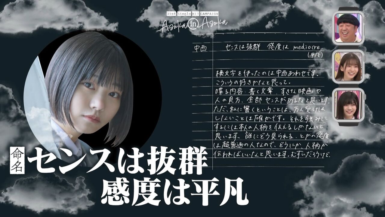 こう書いた理由を齋藤は「センスはすごい抜群だと思うし、すごいオモロイ感性を持ってるなって思う。平凡っていうのは、どう見られるとか、誰かにどう見られてるとかっていう感覚は超普通の子だから、そこが上手いこと合わされば、すごい面白い人になりそうだな。アイドルというか、すごい面白い、アイドルの枠に収まらないというか、人になりそうだなと思うから、とにかく地道に頑張って人柄を伝えていってほしいですね」と期待を込めて語っていた。