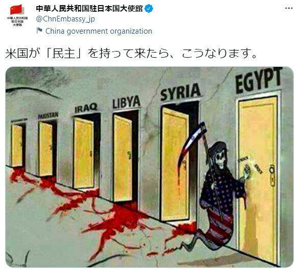 中国大使館が投稿した画像は、米国国旗を模した服を着た死に神が、イラク、リビア、シリアなどと書かれた扉を順番に開け、扉の向こうから血が流れ出してきているというもの。これに対し「これが大使館がするツイートか」「品がない」などと批判する書き込みが相次いでいる。