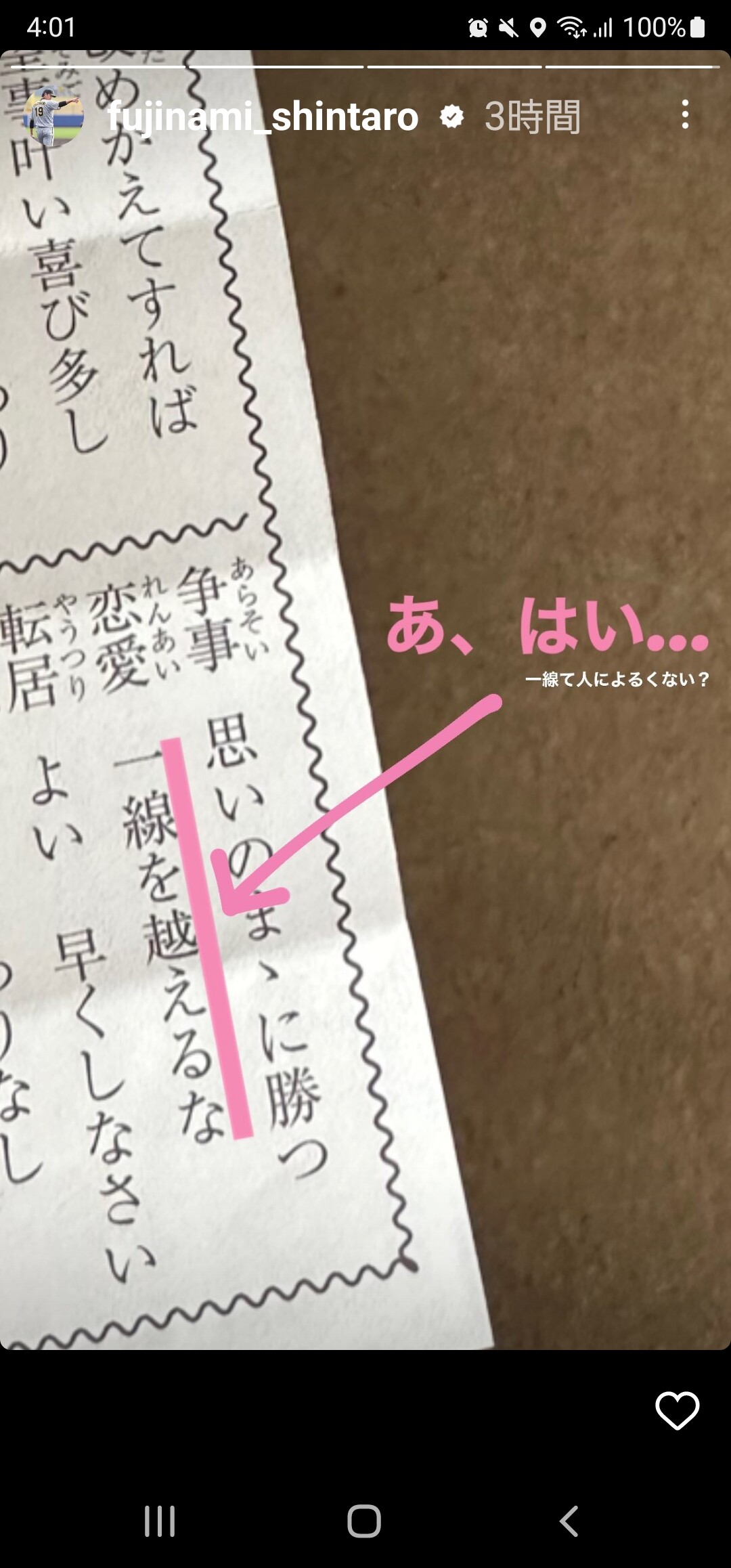 一方で、恋愛の項目で「一線を越えるな」とつづられていることに「あ、はい。一線て人によるくない?」と、戸惑いも隠せない様子をにじませた。