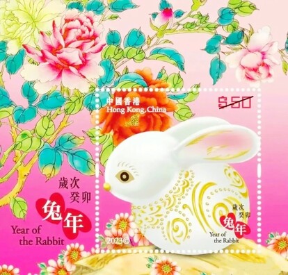 香港の卯年切手のテーマは「瑞兆のウサギで福を手に入れる。新たな年を慶賀する」だ。香港の郵政当局がこの切手を発表したのは2022年12月19日で、発売は1月10日だ。ウサギの伝統工芸品が示されており、技術面では平板加圧印刷と銀箔プレス技術が用いられているので、視覚的に干支のウサギを輝かせて、祝賀の雰囲気を盛り上げている。