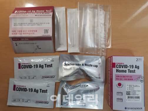 先月30日 ある薬局には SDバイオセンサー社が開発した家庭用の新型コロナ“自己検査キット”が1万6000ウォン(約1565円)で販売されていた。中にはキット2つが入っている。