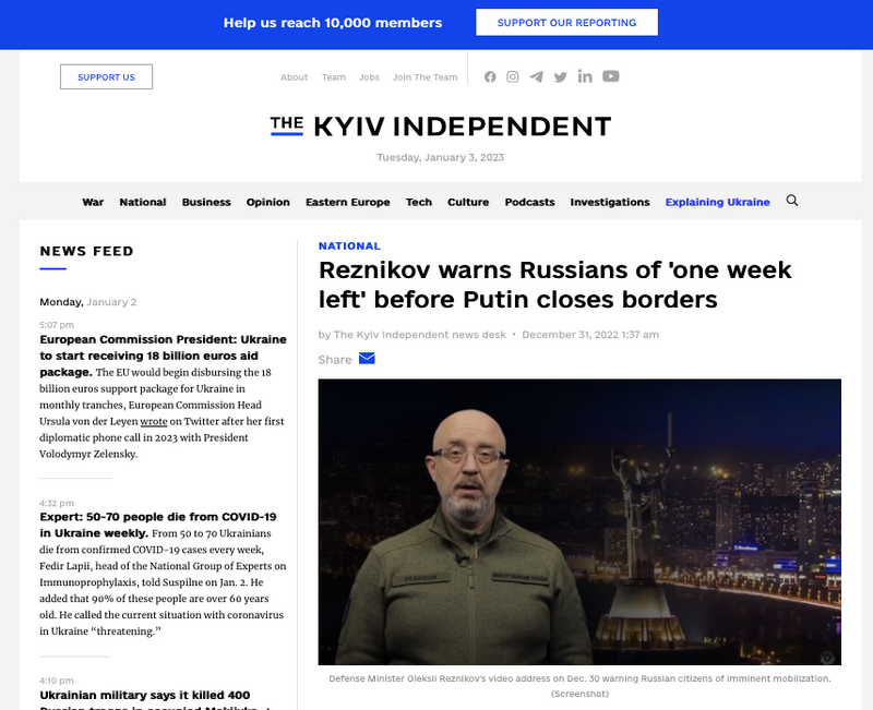 Ukrainian Defense Minister Oleksii Reznikov stated on December 31 that he knew “for a fact” that the Kremlin plans to close its borders for men, declare martial law, and begin another wave of mobilization in “one week or so.”