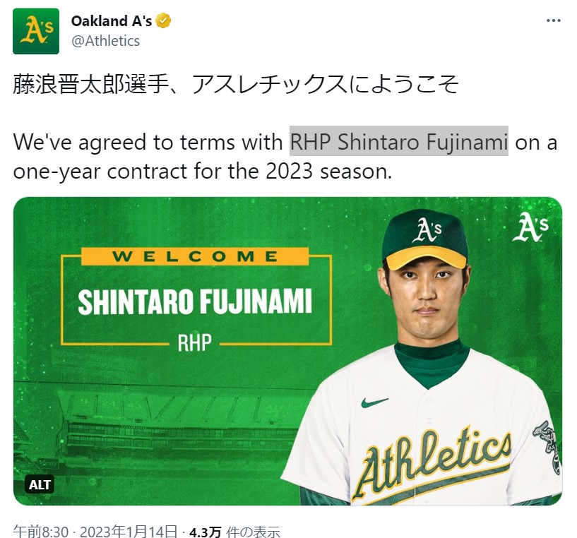 アスレチックス公式、日本語で「藤浪晋太郎選手、アスレチックスにようこそ」