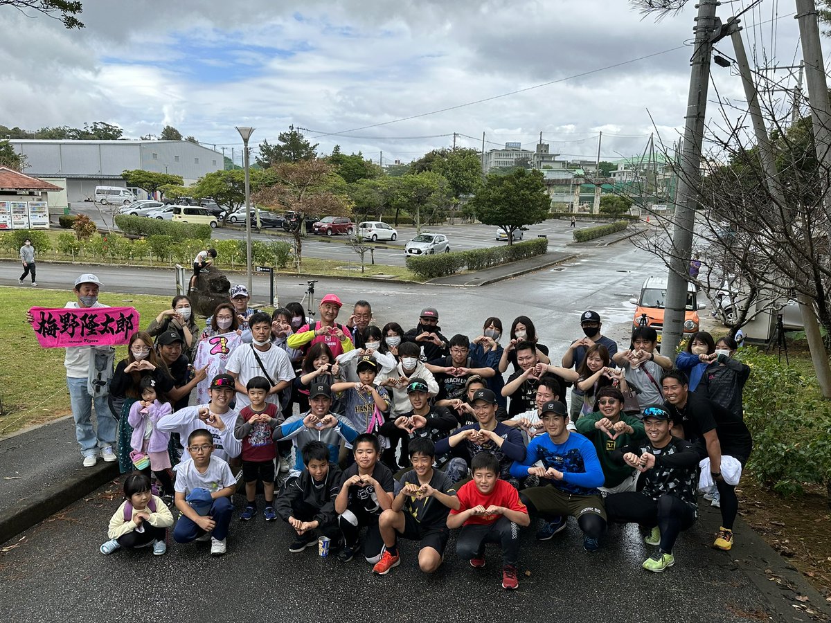 午前の練習終了後、梅野らはファンとともに「ハートU2」ポーズで記念撮影し、交流していた。