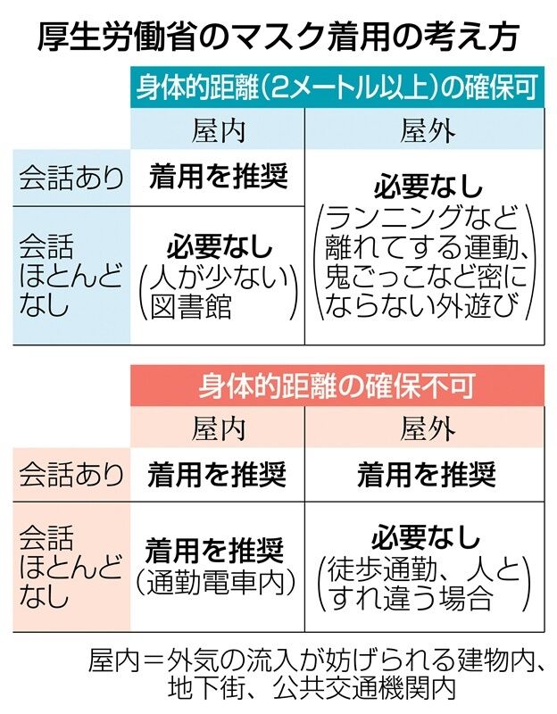 東京医科大の浜田篤郎特任教授(渡航医学)は「マスクの弊害を考えれば、外す場面を増やすことが望ましいが、不安を覚える人も多い。政府はマスクが必要な場面を『不特定多数の人が集まる公共施設』などとわかりやすく整理するとともに、その根拠を丁寧に説明して理解を得る必要がある」と指摘する。