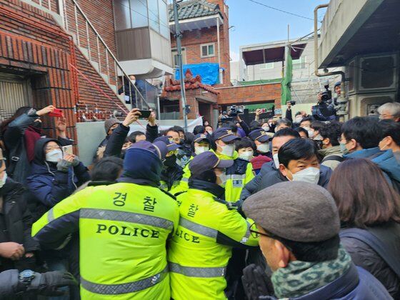 18日午後、大邱市北区大賢洞(テグシ・プック・テヒョンドン)のイスラム寺院工事現場。工事現場へ向かう狭い路地に50人余りが入り乱れ、怒鳴り声が響き渡った。イスラム寺院建設賛成派と反対派、その間に挟まった警察が1カ所に入り乱れて大混乱に陥った。