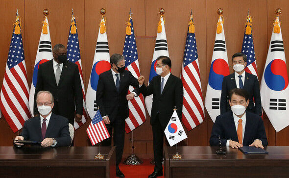 3月18日午前、韓米外交・国防相会議(2+2)終了後の記者会見で、最後の質問者として立った米国「ポリティコ」の記者は、非核化問題をめぐる韓米の意見の隔たりを突くように鋭い質問をした。その記者の指摘のとおり、発言のたびにきちんと「朝鮮半島の非核化」という表現を使うチョン・ウィヨン外交長官とは異なり、アントニー・ブリンケン国務長官は前日から「北朝鮮の非核化」という表現にこだわり、この日の会見でも「我々は北朝鮮の非核化に専念している」という用語を使った。