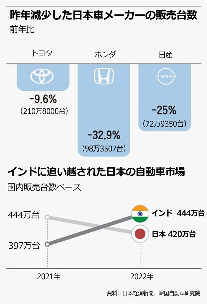 日本車の海外販売台数の減少は明らかだ。トヨタは昨年、米国市場で210万8000台を販売した。前年比で9.6%減少した。昨年上半期(4-9月)のトヨタの純利益は前年同期比23%減の1兆1710億円にとどまった。昨年続いた円安で多額の為替差益を得たことを考慮すると、かなりの業績不振と言える。ホンダは前年比32.9%減の98万3507台、日産は25%減の72万9350台だった。韓国でも19年までトヨタとレクサスはそれぞれ1万台以上売れたが、昨年は両ブランドの合計販売台数が1万3851台にとどまった。日産は20年に韓国市場から撤退。ホンダは年間3000台程度だ。
