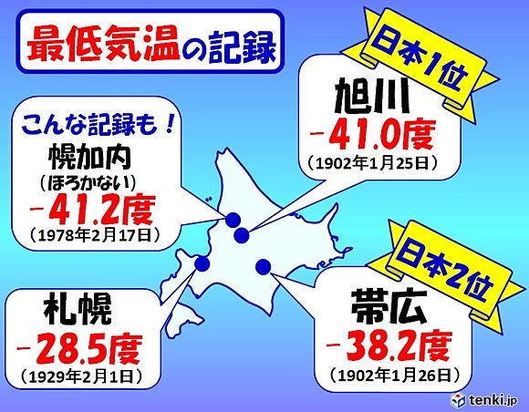 これが日本の最低気温である。 1978年(昭和53年)2月17日に北海道の幌加内町母子里(ほろかないちょうもしり)の北大演習林でマイナス41.2℃を記録したが、気象庁の公式記録の対象から外れていたため、公式では上記の旭川市の記録が最低気温となっている。