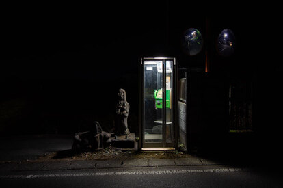 公衆電話ボックスの光に照らされ、怪しげにその姿が浮かび上がる、仏像。