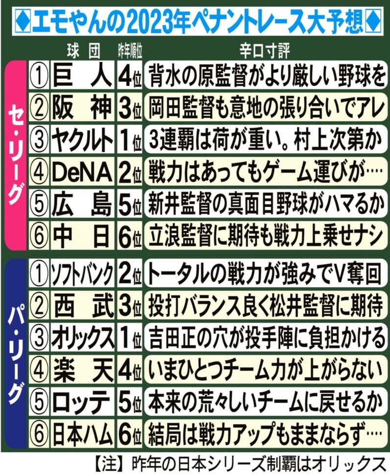 【エモやん】日本一早い2023年順位予想 セは巨人、パはソフトバンク