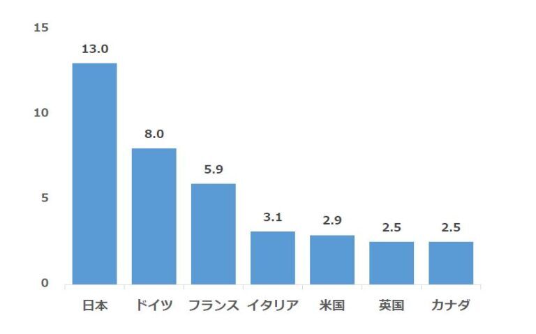 経済開発協力機構(OECD)がまとめた最近のデータによると、人口1,000人当たりの病床数は日本が13.0床で、主要7カ国では、ドイツ8.0床、フランス5.9床、イタリア3.1床、米国2.9床、英国2.5床などに比べて圧倒的に多くなっています。急性期の病床に限っても日本は7.79床で加盟国の平均3.6床に比べて2.2倍以上突出しています。病院数は2016年のデータでは、日本は8,442カ所と最も多く米国の1.5倍となっています。