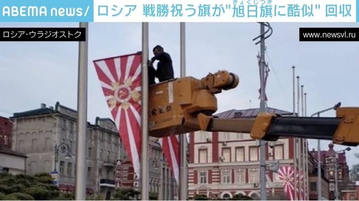地元メディアによると、ロシアのウラジオストクで、広場に掲げられたナチスドイツへの戦勝記念日を祝う旗が「旧日本軍の旭日旗に似ている」という抗議が市民から殺到。この事態を受けてウラジオストク市は7日、30本の旗全てを回収し、違うデザインのものに取り換えると発表した。