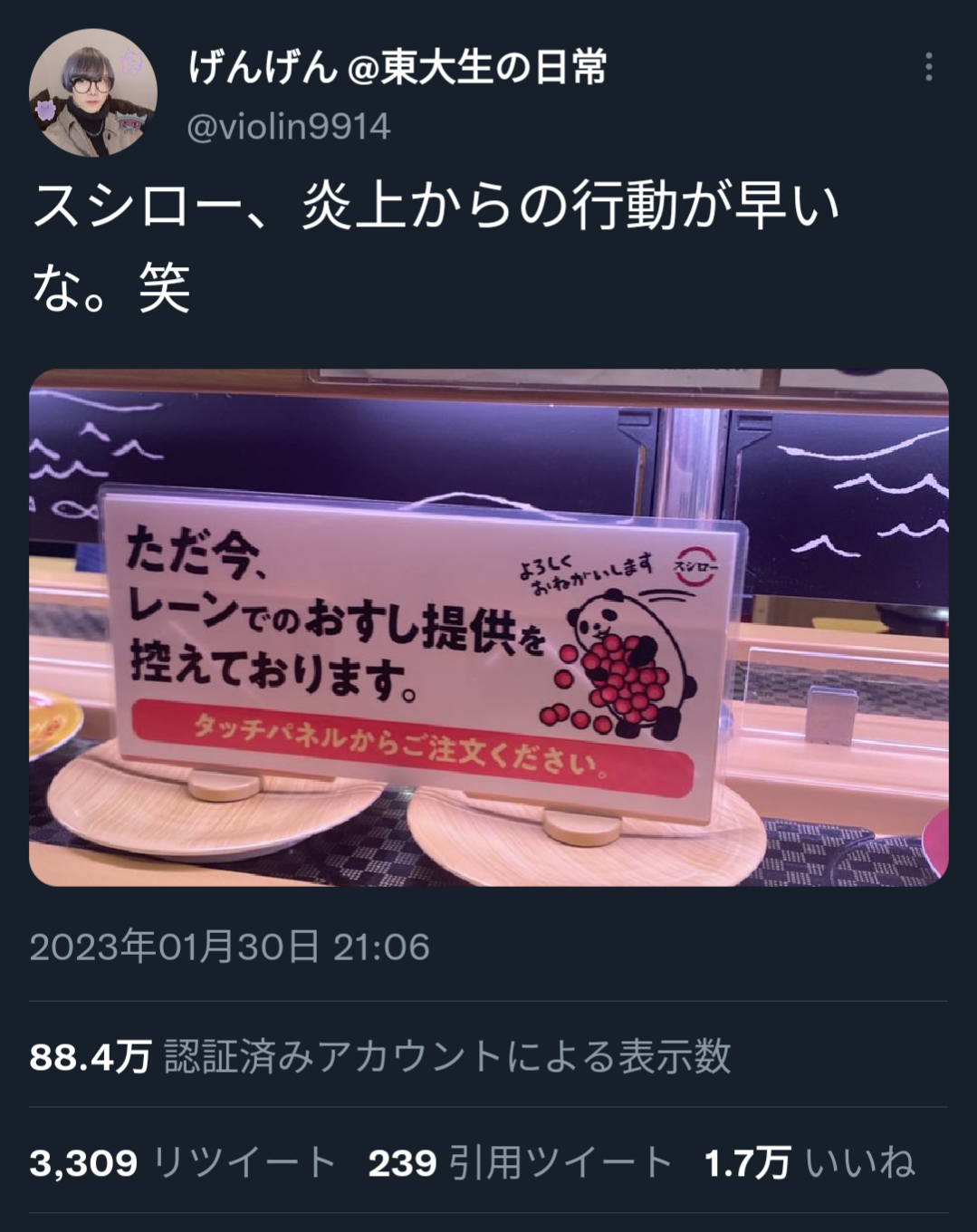 げんげん @東大生の日常@violin9914スシロー、炎上からの行動が早いな。笑 https://t.co/75ZFXguycP2023/01/30 21:06:55