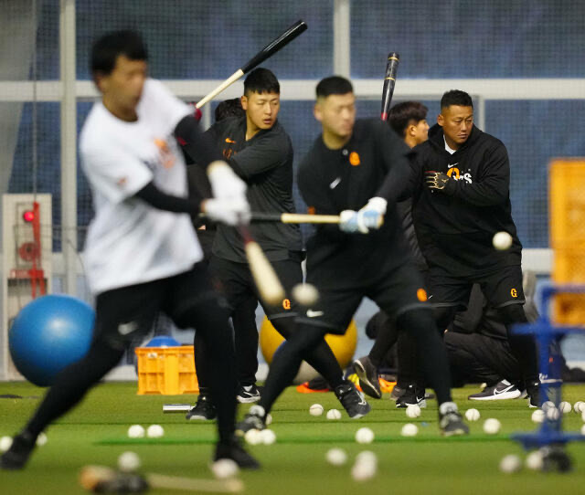 チーム宿舎の部屋から、次々と目覚まし時計が鳴り響いた、に違いない。7時スタートのアーリーワーク。6時50分ごろ、室内練習場に続々とバットを握った選手が着いたとき、宮崎の空はまだ真っ暗だった。外国人を除く18人による、朝からティー打撃。一心不乱にスイングする湯浅、秋広、増田陸ら若手もいれば、1球1球確かめるように打つ丸や坂本もいた。ペースはおのおの。ネット目がけて振り続けた。