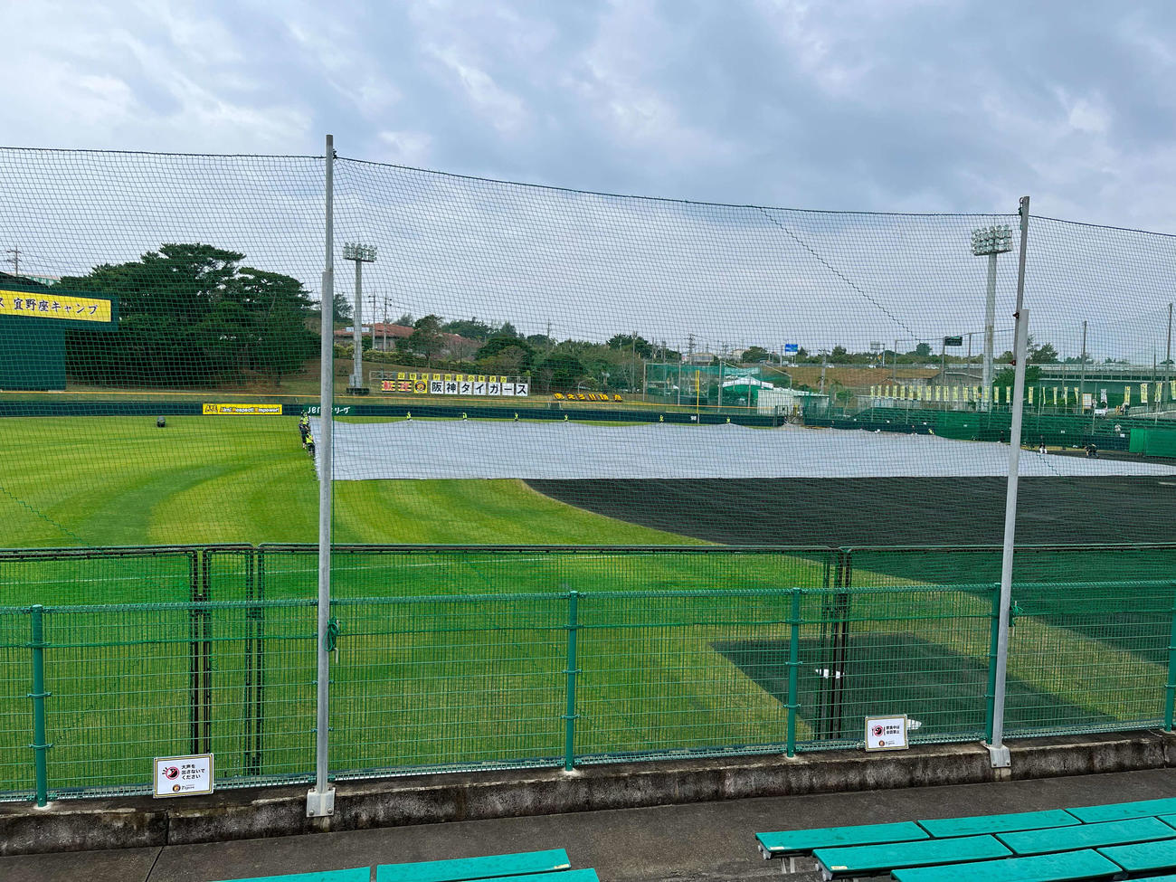 阪神の沖縄・宜野座での1軍春季キャンプは5日、第2クール2日目に入った。朝方に雨が降り続いていたが、グラウンド整備を担当する阪神園芸は準備バッチリ。前日からメイングラウンドの内野黒土部分に全面シートを敷いていた。
