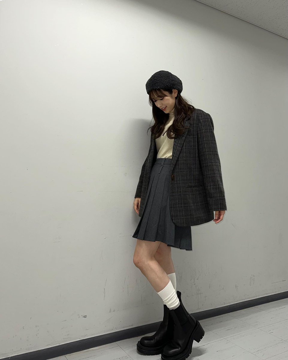佐々木は、自身のInstagramアカウントにて、「右の靴下伸ばし過ぎたなー」といったコメントと共に、帽子を被り、ジャケットと膝上丈のスカートに白ソックスを合わせたコーディネートを公開した。