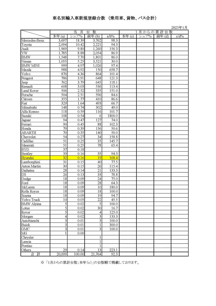 2023年02月06日、『日本自動車輸入組合』が2023年01月の「輸入車新車登録台数速報」を公表しました。以下にデータを引用します。