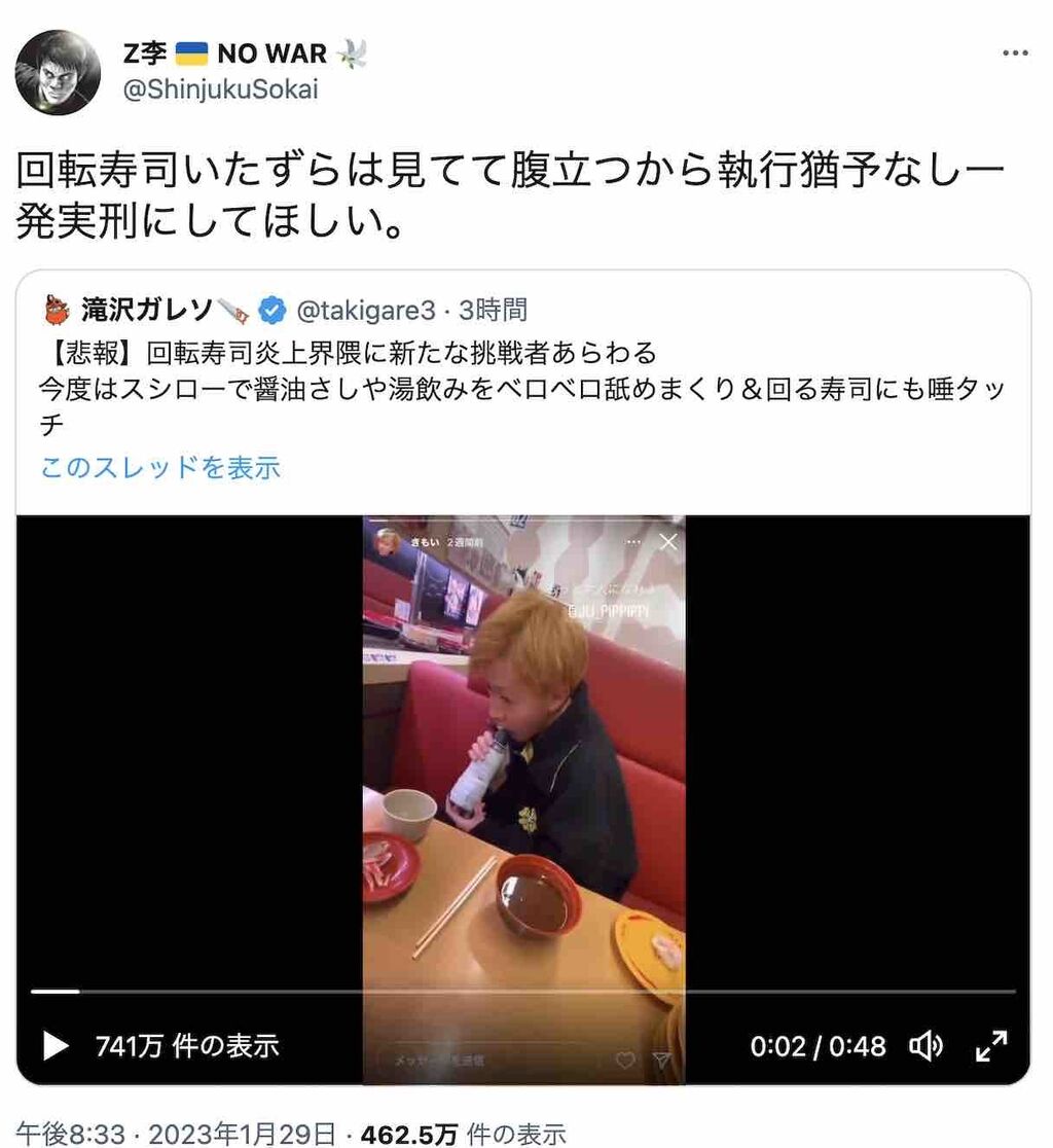 スシローは迷惑行為を受け、当該店舗のすべてのしょうゆボトルの入れ替えと、湯飲みの洗浄を余儀なくされた。動画拡散後、株価は160億円以上も下落。大損害だった。渦中の少年は、岐阜県内の公立高校に通う男子高校生だった。