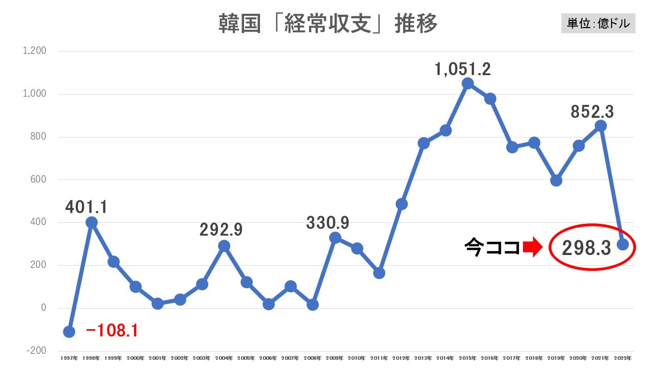 2022年にいかにひどく落ち込んだのかが一目瞭然です。韓国の経常収支は「2010年:279.5億ドル」水準まで落ち込みました。