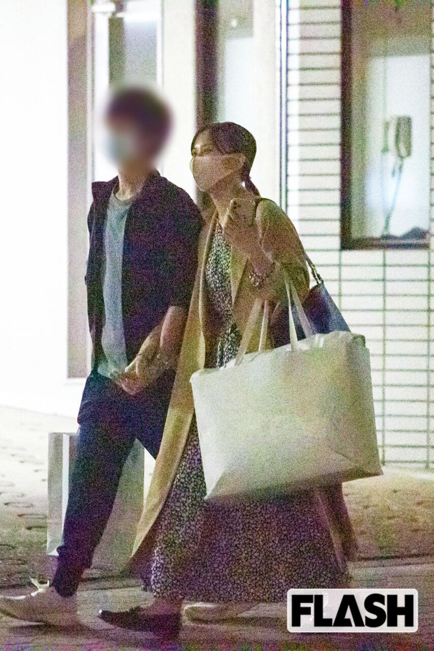 お揃いの紙袋を抱え、手を繋いで歩く山本アナとカレ