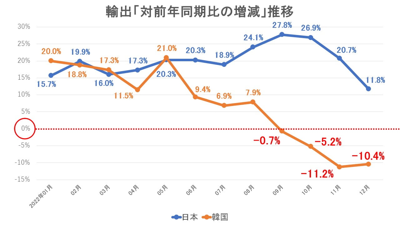 韓国は2022年01月こそ「+20.0%」(つまり2021年01月の1.2倍の輸出金額だった)でスタートしたものの、05月を最後に一桁パーセント増に下落。