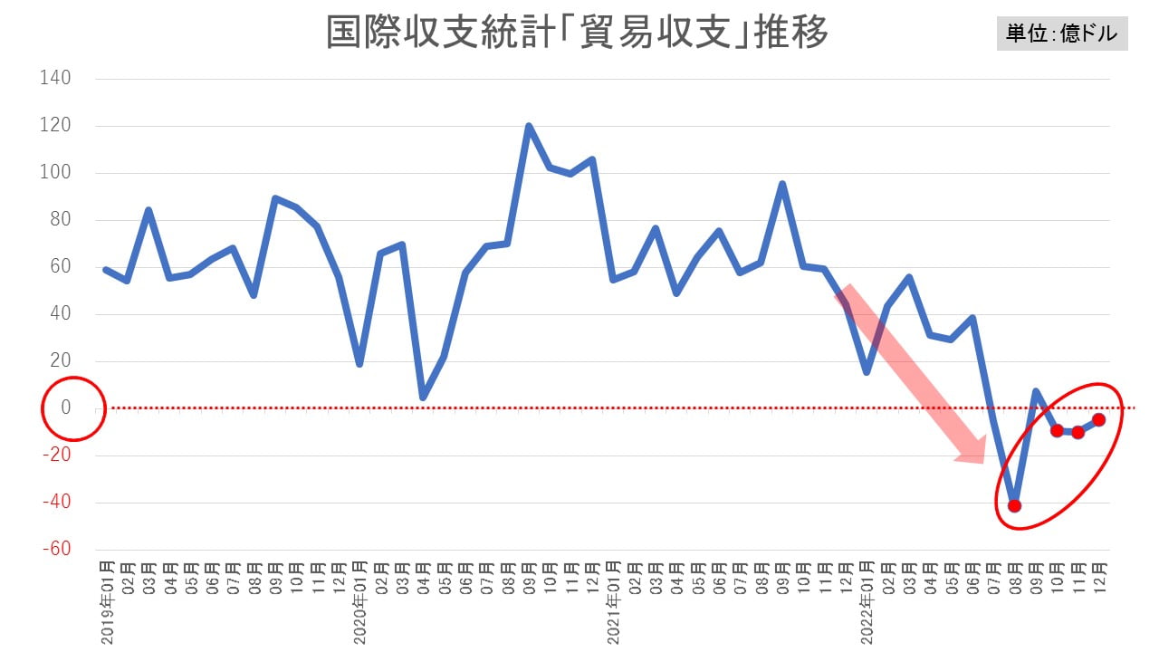 エネルギー:エネルギー価格の高騰が「輸出 ? 輸入」の「輸入金額」を拡大して黒字を圧迫している