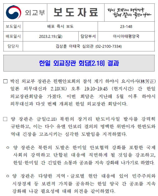 日本の外務省からは「日韓外相会談について」のプレスリリースはまだ出ていません(2023年02月19日11:29現在)※。