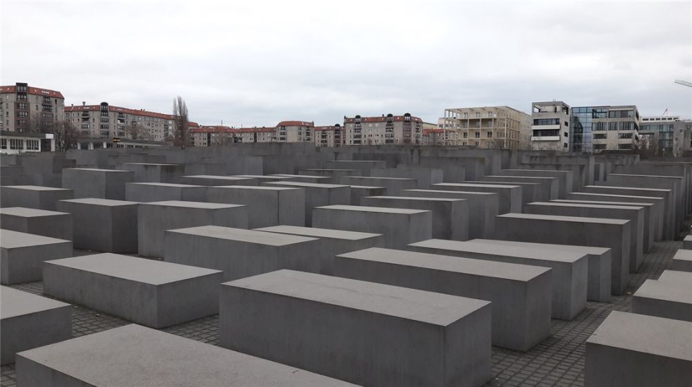 ▲ユダヤ人集団虐殺(Holocaust)を象徴するベルリンのユダヤ人追悼公園。四角形の造形物は犠牲者の柩を象徴するという。