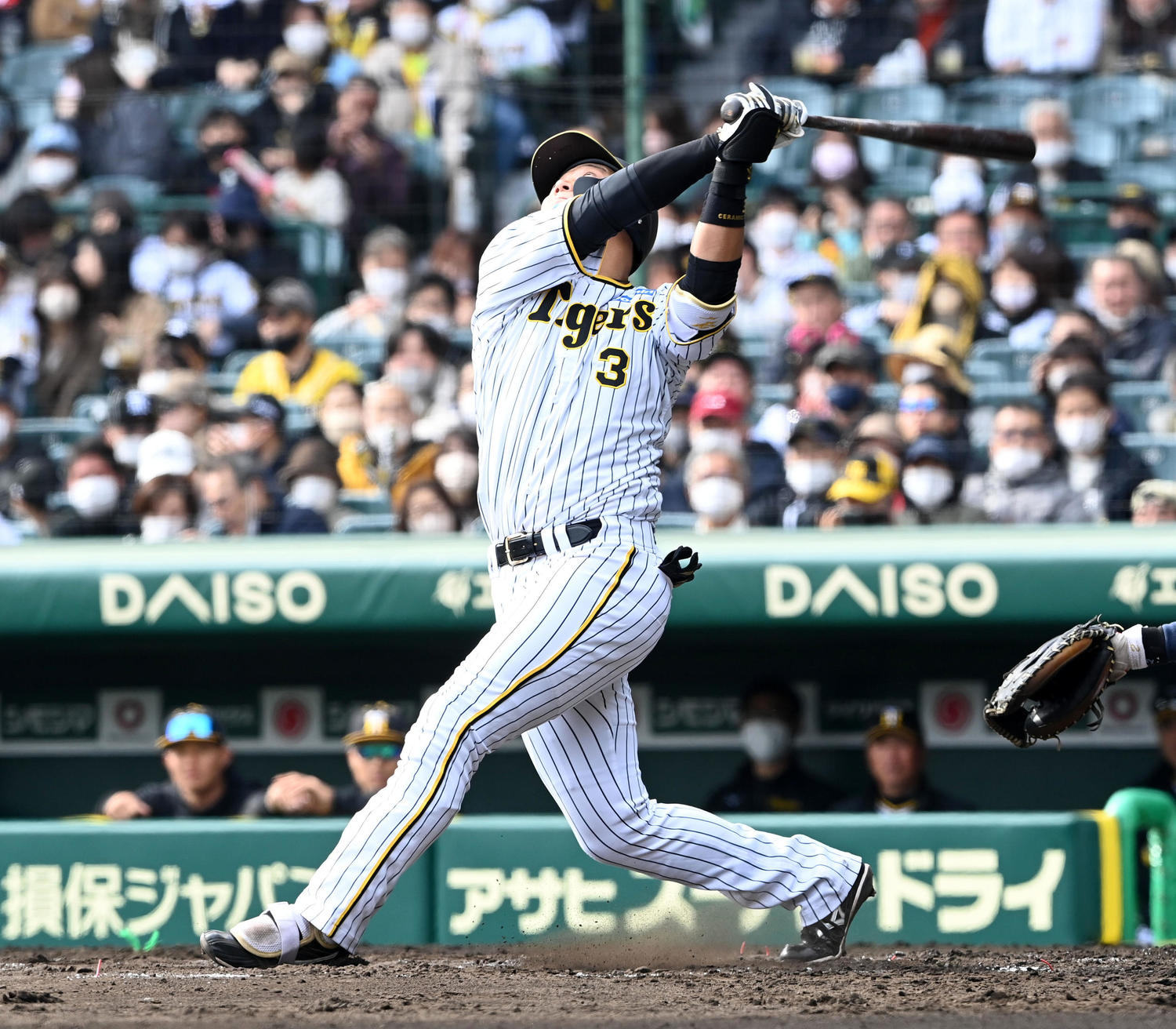 初回2死一塁。カウント1-2からオリックス山岡の115キロ変化球を左前に打ち返した。2月の沖縄実戦は計25打数1安打。対外試合では23打席無安打と沈黙が続いていたが、ようやく待望のヒットが生まれた。続く佐藤輝の四球で満塁となると、板山のタイムリーで2点を先制。春の甲子園に久しぶりの六甲おろしが鳴り響いた。