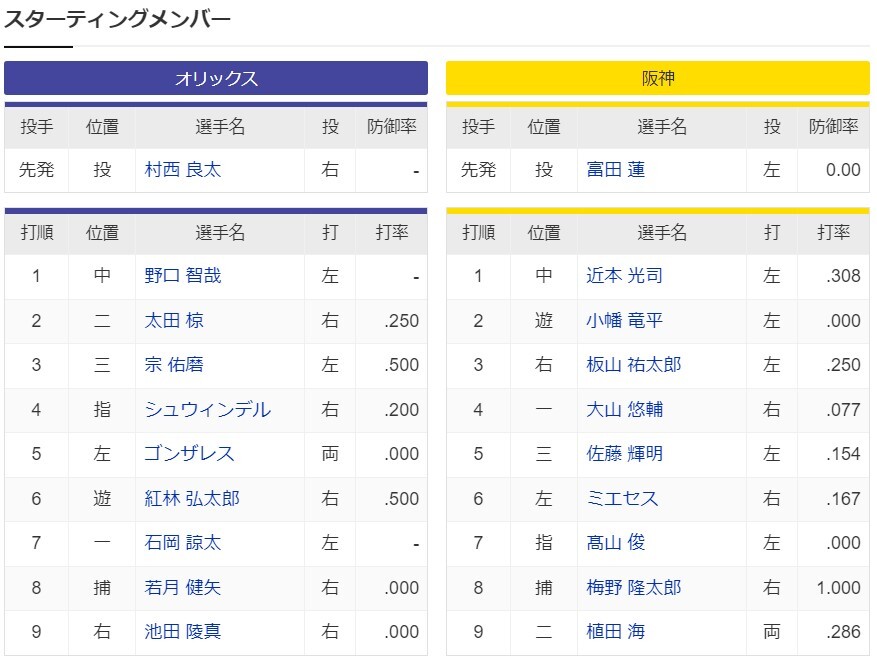 【オープン戦】オリックスー阪神 スタメン 京セラドーム