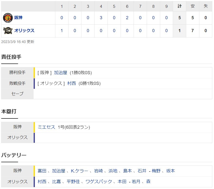 【オープン戦】オリックス1ー5阪神 試合結果 京セラドーム