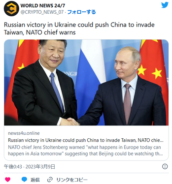 アジアで戦争が起きることをNATO長官が警告、ウクライナでロシア勝利により中国が台湾に軍事侵攻を始める可能性