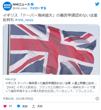 【英】 「ドーバー海峡越え」の難民申請認めない法案 ドーバー海峡をボートで渡ってきた場合は原則として送り返す