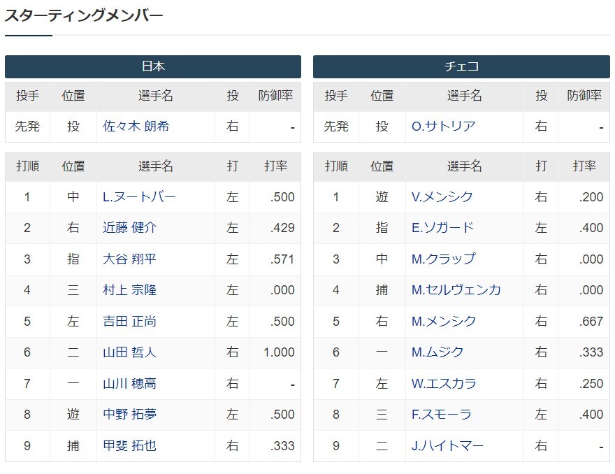 スタメンが発表され、不振にあえぐ村上宗隆内野手は4番で起用された。また山川が今大会初めてスタメンに名を連ね、10日の韓国戦で右手を負傷した源田はベンチスタート。代わりに「8番・遊撃」に中野が入った。
