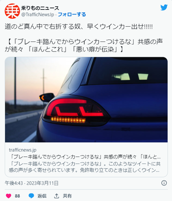 【迷惑運転】早すぎるとカッコ悪い?「ブレーキ踏んでからウインカーつけるな」に共感の声「ほんとこれ」 ベテランほど悪い癖