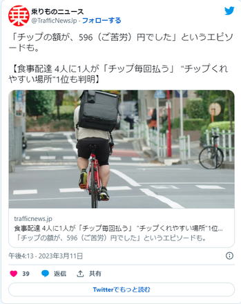 食事配達 4人に1人が「チップ毎回払う」 チップをケチるやつって何なの?
