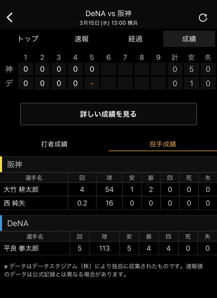 阪神の先発・大竹は4回1安打無失点と好投した。