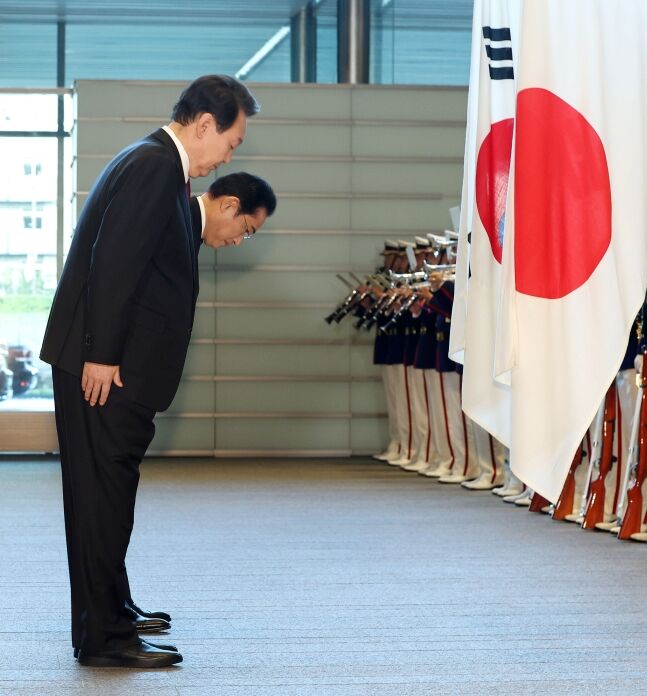 尹大統領は同日午後、東京都内の首相官邸で行われた岸田首相との拡大首脳会談前、儀仗隊が並ぶ中で日の丸の横にある太極旗(韓国国旗)に礼をした後、岸田首相が日の丸と太極旗に向かって腰を曲げて礼をすると、その隣で目礼をした。