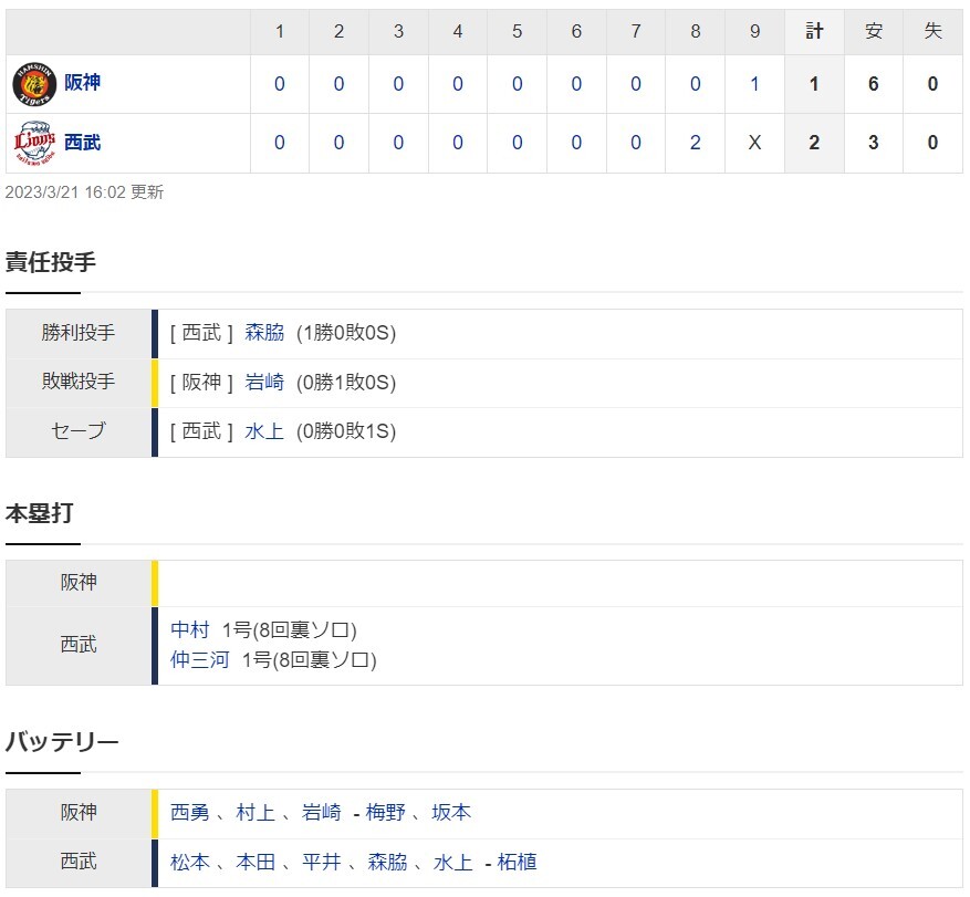 【オープン戦】西武2ー1阪神 試合結果 ベルーナドーム