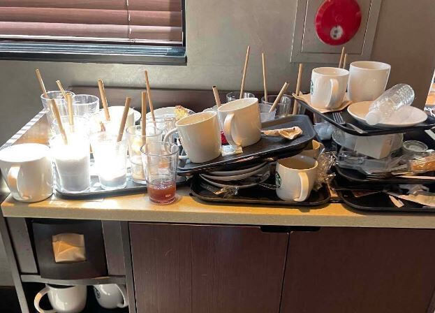 「ああならないように管理するのが従業員の仕事ではないのか」「写真を撮ってアップする時間があるなら片付けた方がいい」「トレーやカップを置く場所がないので仕方ない」など否定的なコメントが寄せられている。