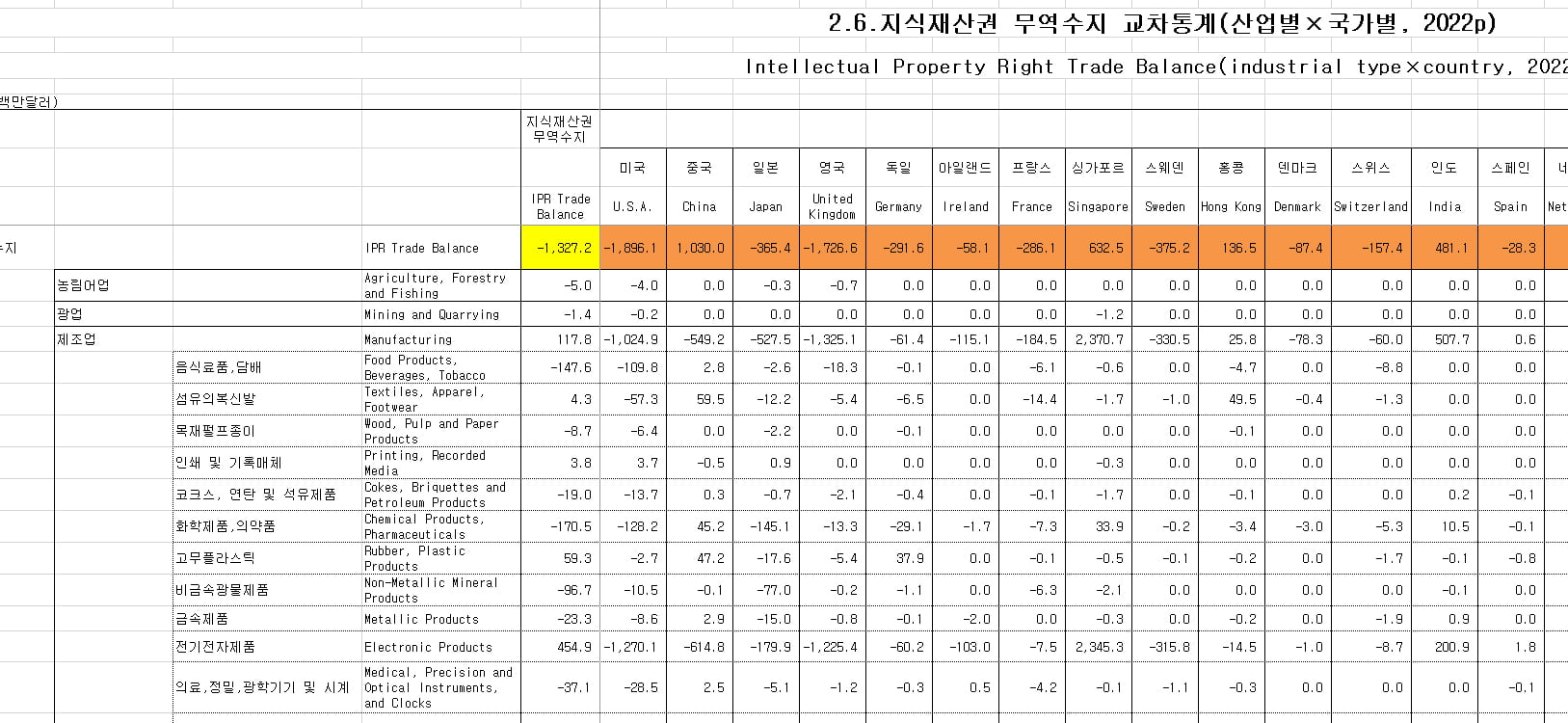 このデータを見ると、韓国の知的財産権の貿易は2022年は赤字でした。以下をご覧ください。『韓国銀行』が公表したエクセルのデータから切り出した、品目 ? 国別のクロス集計シートです。