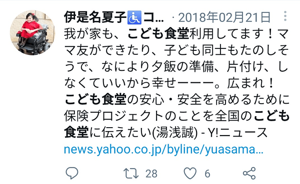 この問題が発覚した経緯は、伊是名夏子さんが過去(2018年2月21日)に自身のTwitterで「我が家も、こども食堂使用してます!ママ友ができたり、子ども同士もたのしそうで、なにより夕食の準備、片付け、しなくていいから幸せーーー。広まれ!」などとツイートしていたということです。