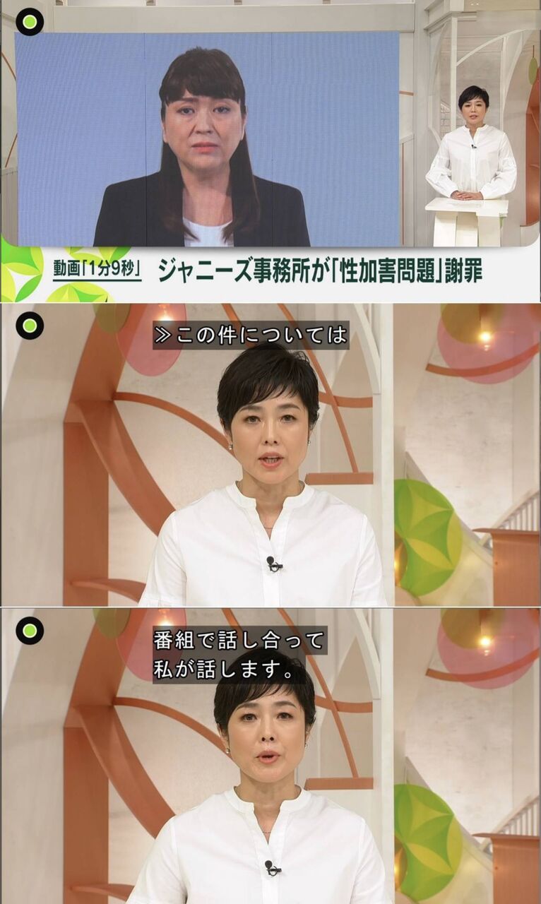 この問題に入る前には櫻井が画面から姿を消し、有働だけで進行。さらにVTRが終わった後に、有働が「この件については、番組で話し合って私が話します」と切り出し「まずは性被害については、被害者のケアを最優先にしてほしい。そして、エンタメを通じてたくさんの夢を見せてきてくれたジャニーズだからこそ、ファンや私たちが迷いなく夢を見続けられるようにしてほしい。そのためには今回の説明にとどまらず、プライバシーを守ったうえでですが、情報をオープンにする社会的責任を果たしていくべきだと思います」と話した。