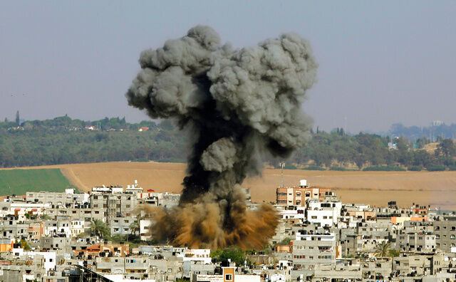 11日、パレスチナ自治区ガザ地区で、イスラエル軍の空爆で煙が上がった=AP