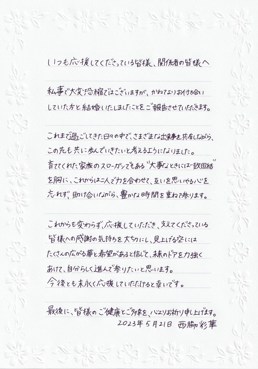 西脇は「いつも応援してくださっている皆様、関係者の皆様へ」と題した直筆メッセージを投稿。「私事で大変恐縮ではございますが、かねてよりお付き合いしていた方と結婚いたしましたことをご報告させていただきます」と伝えた。