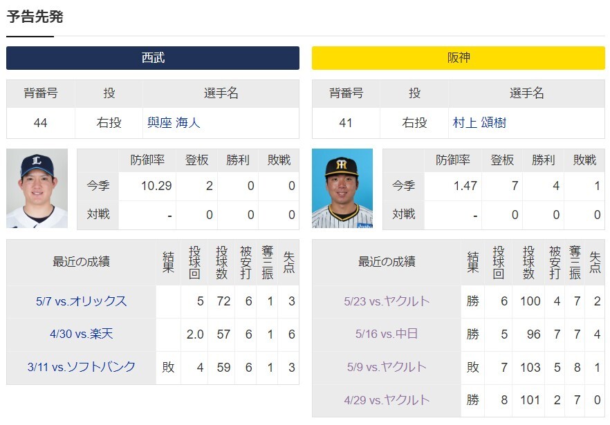 【交流戦】予告先発 村上頌樹 ー 與座海人